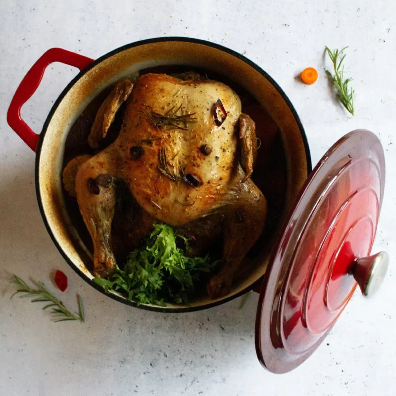 Puode keptas viščiukas su rudeninėmis daržovėmis ir rozmarinais