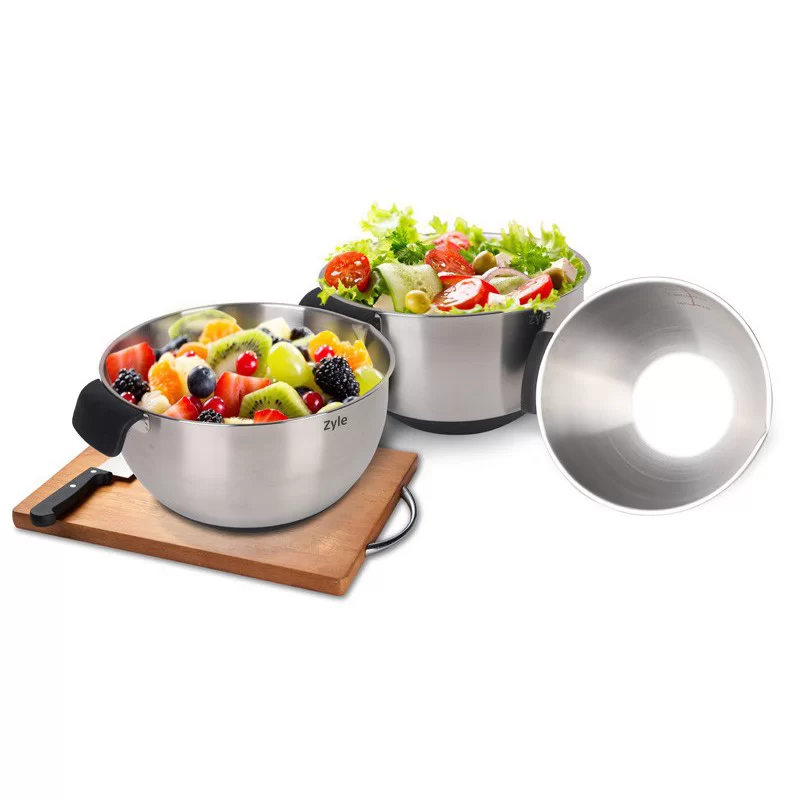 Zyle „ZY191WS“ rinkinį sudaro 3 skirtingo dydžio nerūdijančio plieno dubenėliai. Jų apačia yra gumuota, todėl dubenėliai nenuslys nuo bet kurio paviršiaus ir bus patogūs naudoti. Kiekvienas dubenėlis šone turi patogią rankenėlę, talpos matavimo skalę vidinėje dalyje ir snapelį pylimui. Pagaminta be BPA.