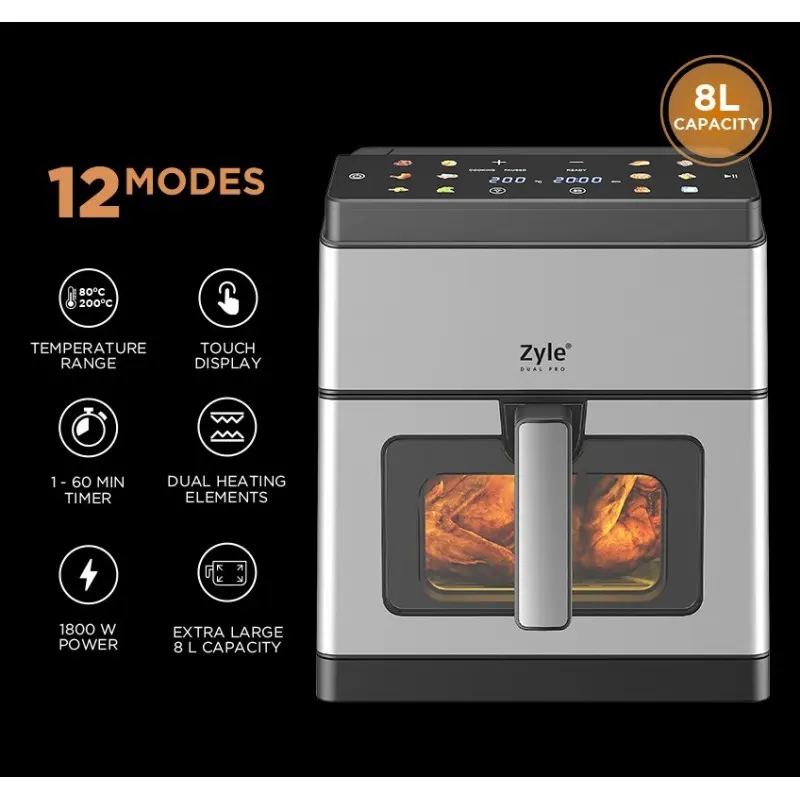 Karšto oro gruzdintuvė Zyle ZYDUALPROW, su dvigubu kaitinimo elementu, 1800 WAtraskite dar tobulesnį gruzdinto maisto skonį su dar pažangesne karšto oro gruzdintuve Zyle!