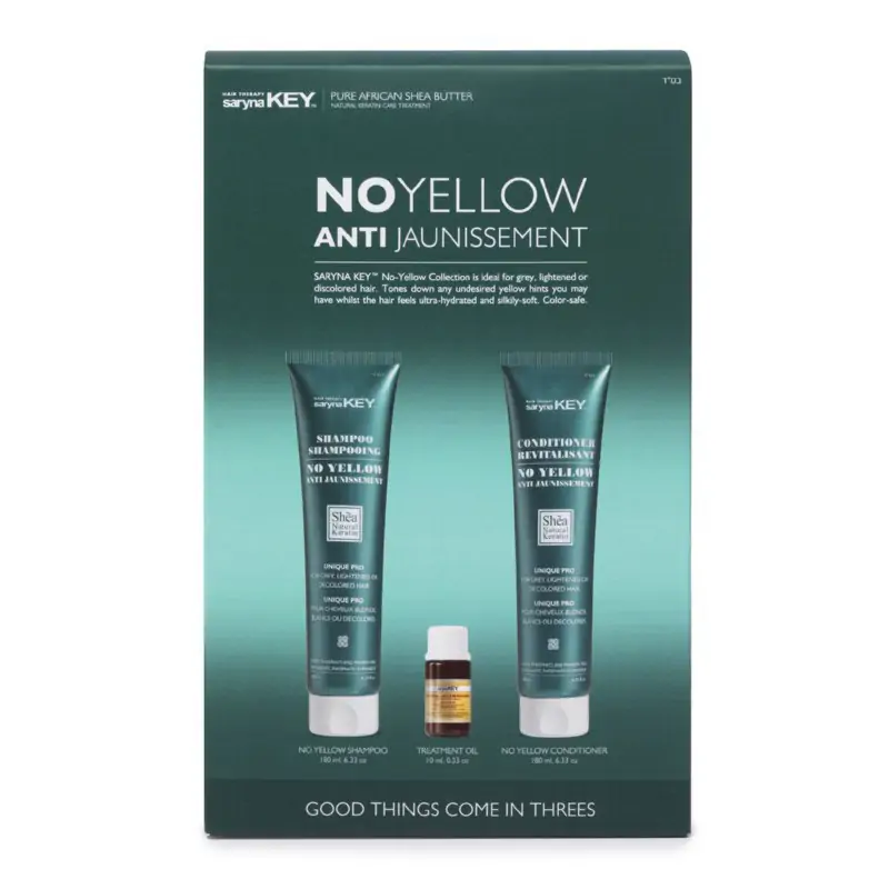„Saryna Key“ plaukų priežiūros priemonių rinkinį sudaro: Saryna Key „No Yellow“ plaukų šampūnas, 180 ml, Saryna Key „No Yellow Conditioner“, 180 ml ir plaukų aliejus Saryna Key „Damage Repair Treatment Oil“, 10 ml.